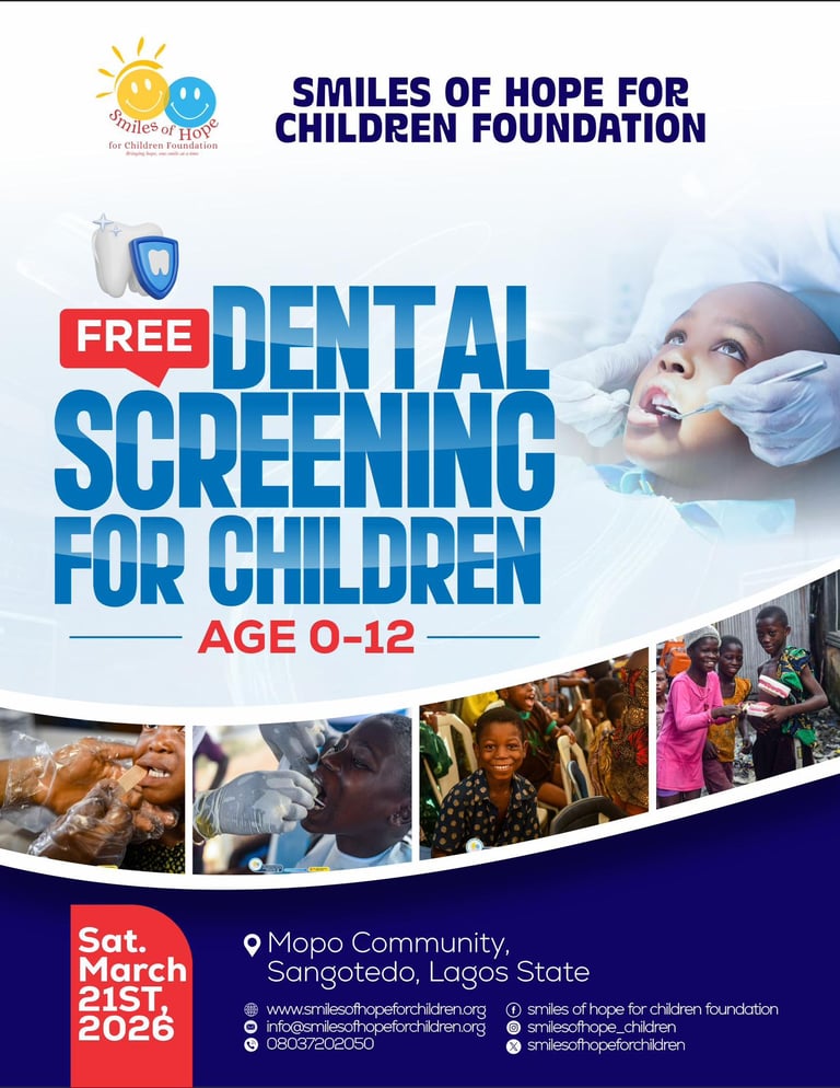 In celebration of the World Oral Health Day, the Smiles of Hope for Children Foundation will be going to the underserved community of Mopo in Songotedo Lagos